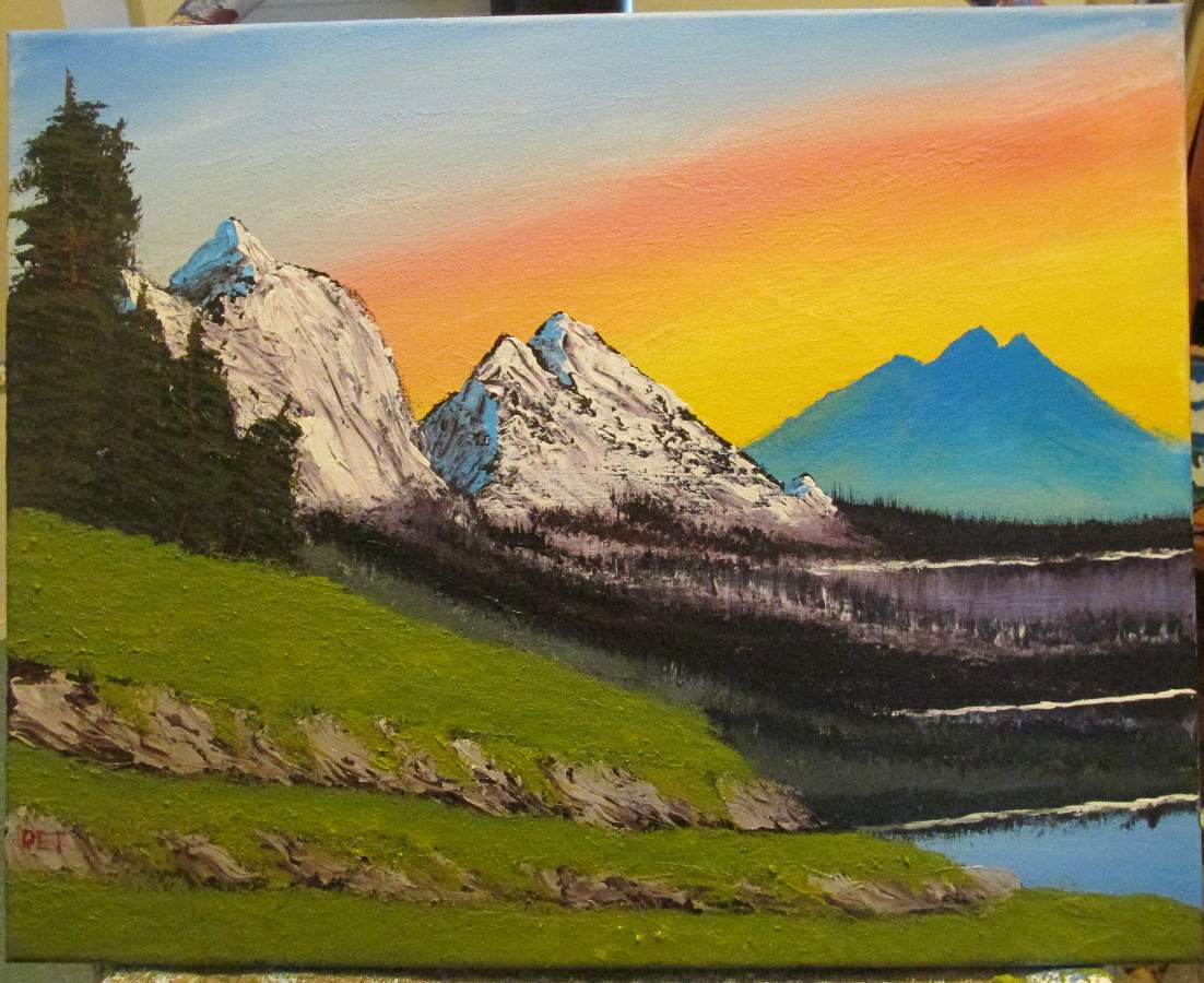 Painted on a 20 x 16 canvas. This is a repaint because I did not like my original. I added an extra lake and made the far mountain slightly too large. I tried to keep the mountains simple because I tend to have issues with complex mountains, peaks, and ridges.