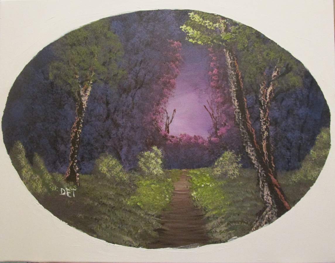 Painted on a 20 x 16 canvas with an oval cut out. The black paint ran some under the contact paper, so I had to add some white touch ups to the outside. I am happy with the painting overall. Some of the blending could be better, but I tried to get a soft misty scene. I added some bushes in the back to add some depth.