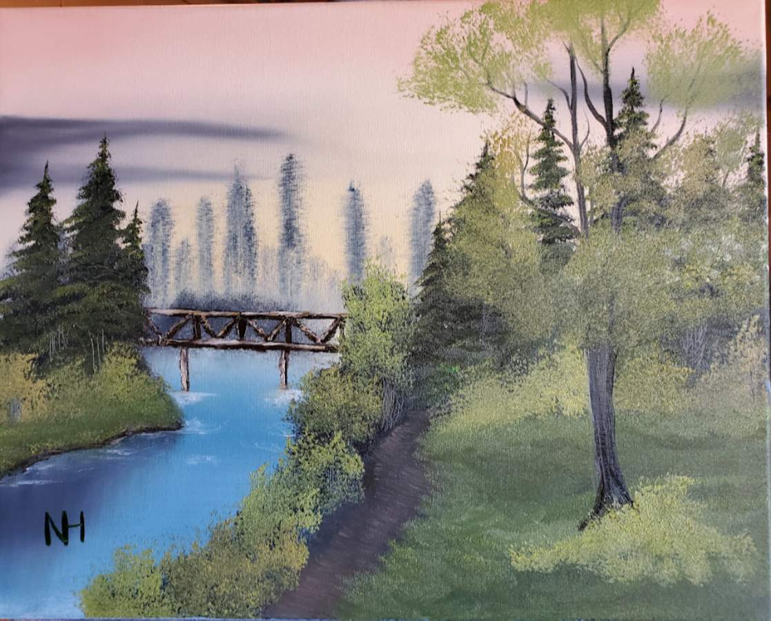 I really enjoyed doing this one, up until the bravery test. The subdued sky looks really nice, and the bridge was a lot of fun. Adding the bravery test tree kind of ruined it all for me, but the painting still ended up looking pretty nice. I planned to give this one to my parents, but my daughter said she wanted it, so I guess I'll let them fight over it :)