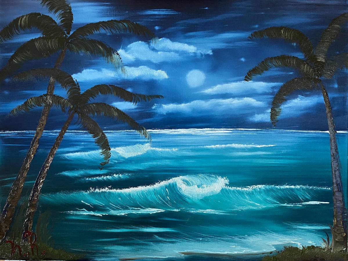 A really great painting with great transition in the colouring of the water. Elvis with his ukulele wouldn't have been out of order here. He was probably under the next palm tree. Absolutely great.