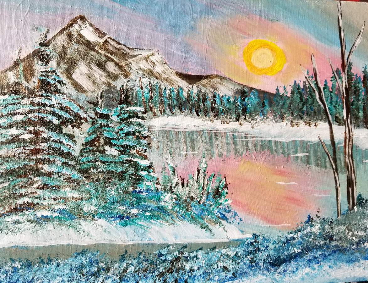 This was definitely more difficult to do in acrylics. A lot more tricky to blend out the sky and water. I find I'm waiting around more for things to dry before I add another layer. But it turned out lovely, especially since it was painted over a not so happy accident.