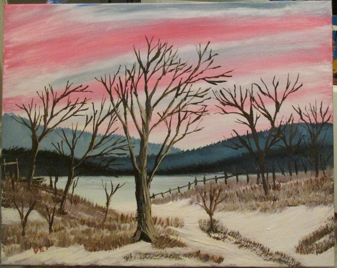 Painted on a 20 x 16 canvas. I changed the sky a bit by adding in streaks of white. I used the a wisp brush for the brown grasses. I hope the grasses look good cause I am satisfied with them. The trees were fun and made sure to add plenty of branches. The fence fell down on the right side.