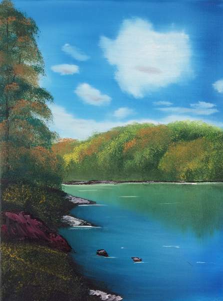 Good job here! It is quite difficult to paint from the photo, but it teaches seeing the color. Trees and water and reflections nicely done!