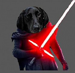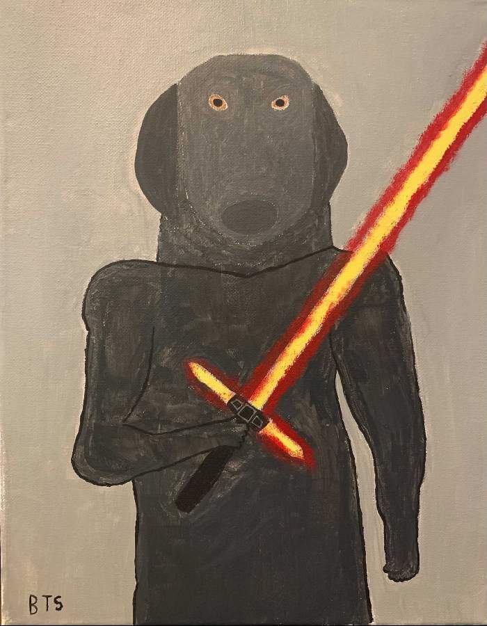 My coworker named their dog after Kylo Ren so I painted them this portrait. I really like how the red fiery glow comes out of the lightsaber. I dipped a sponge in acrylic. I could obviously use some help learning how to draw/paint body dimensions, but overall I'm satisfied. It was a fun painting.