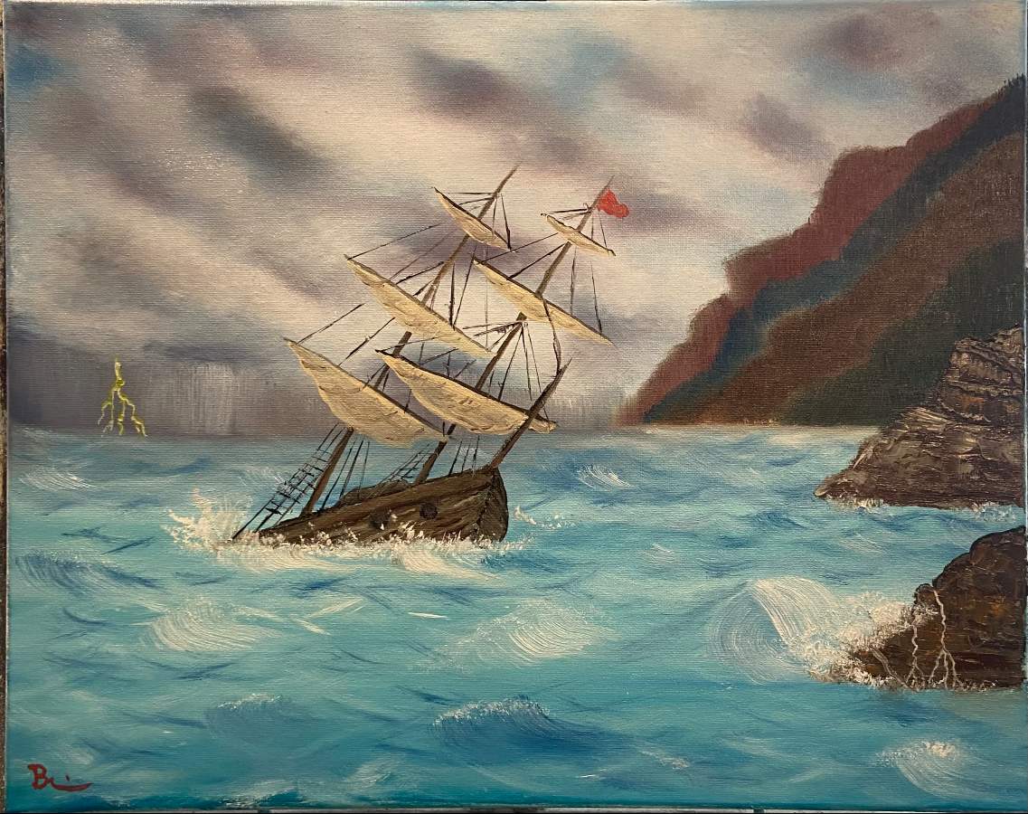 Based on a painting by Angelika Fomicheva. This one was a ton of fun! In hers the sails are all unfurled to the wind and the boat looked like it was going to run aground. So I thought that I would try to save the brave crew and anchored the boat in mine.