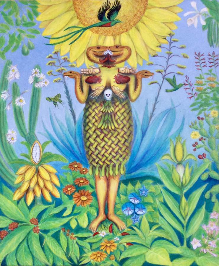 This is my homage to Mexico, her gifts to the world, and her rich ancient culture, connecting to more recent vibrant women artists, especially Frida Khalo, Ramedios Varo, and Leonora Carrington (although she was born in U.K.)