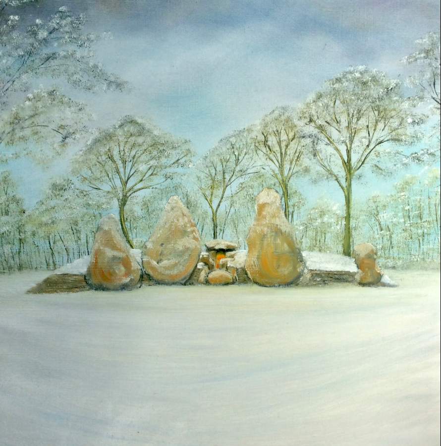 A seasonal picture, based on one of the legends attached to this Neolithic monument and Wayland the mythical and magical Saxon metal smith. The fire of his forge is blazing like the low Midwinter sun.
