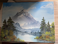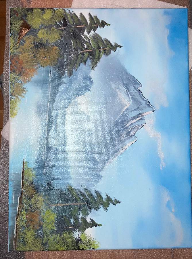 My first painting, main issue is the water line not being completely horizontal. Pleased with my bushes, trees and sky.