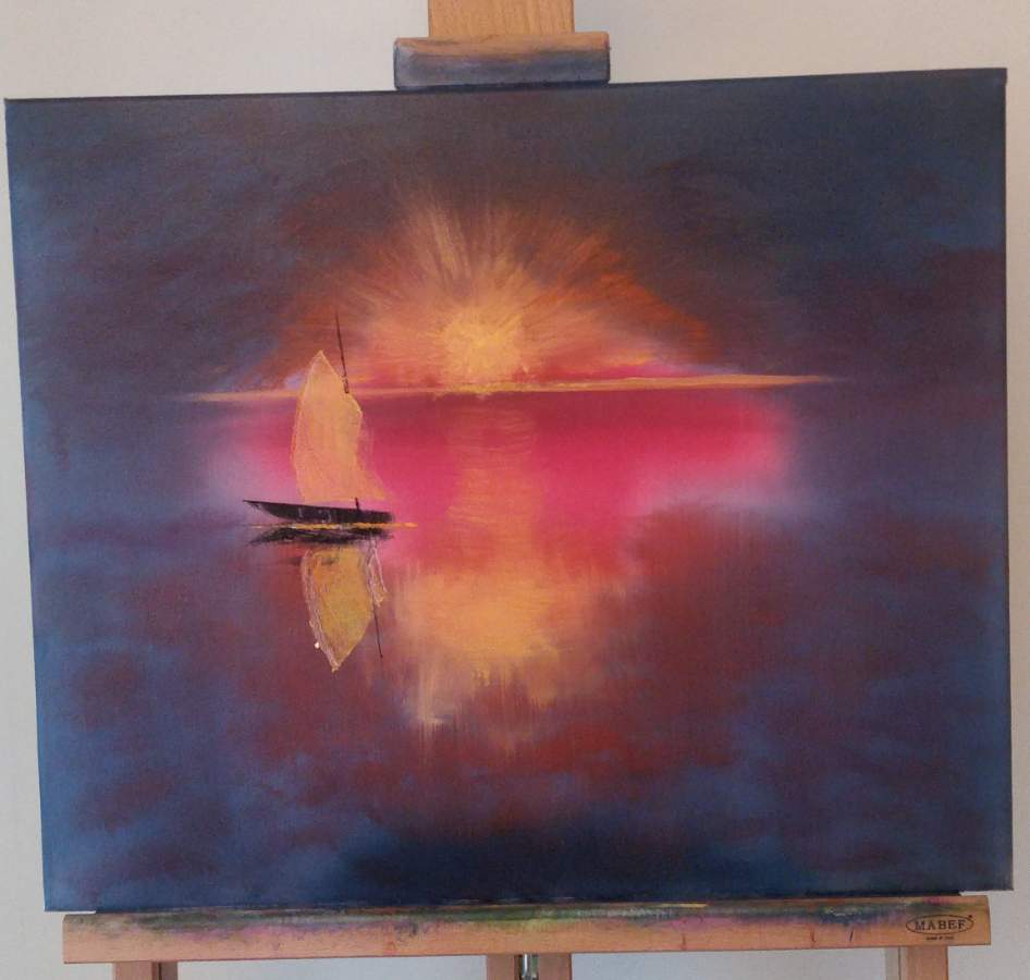 I painted Bill Alexander's Sunset Sailboat. It came out bluer than Bill's painting, otherwise I'm very happy with it! Even the sailboat came out okay, even when I'm pretty clumsy with the knife. A happy accident slipped into the reflection - the mast is slanted the wrong way! Doh! :P