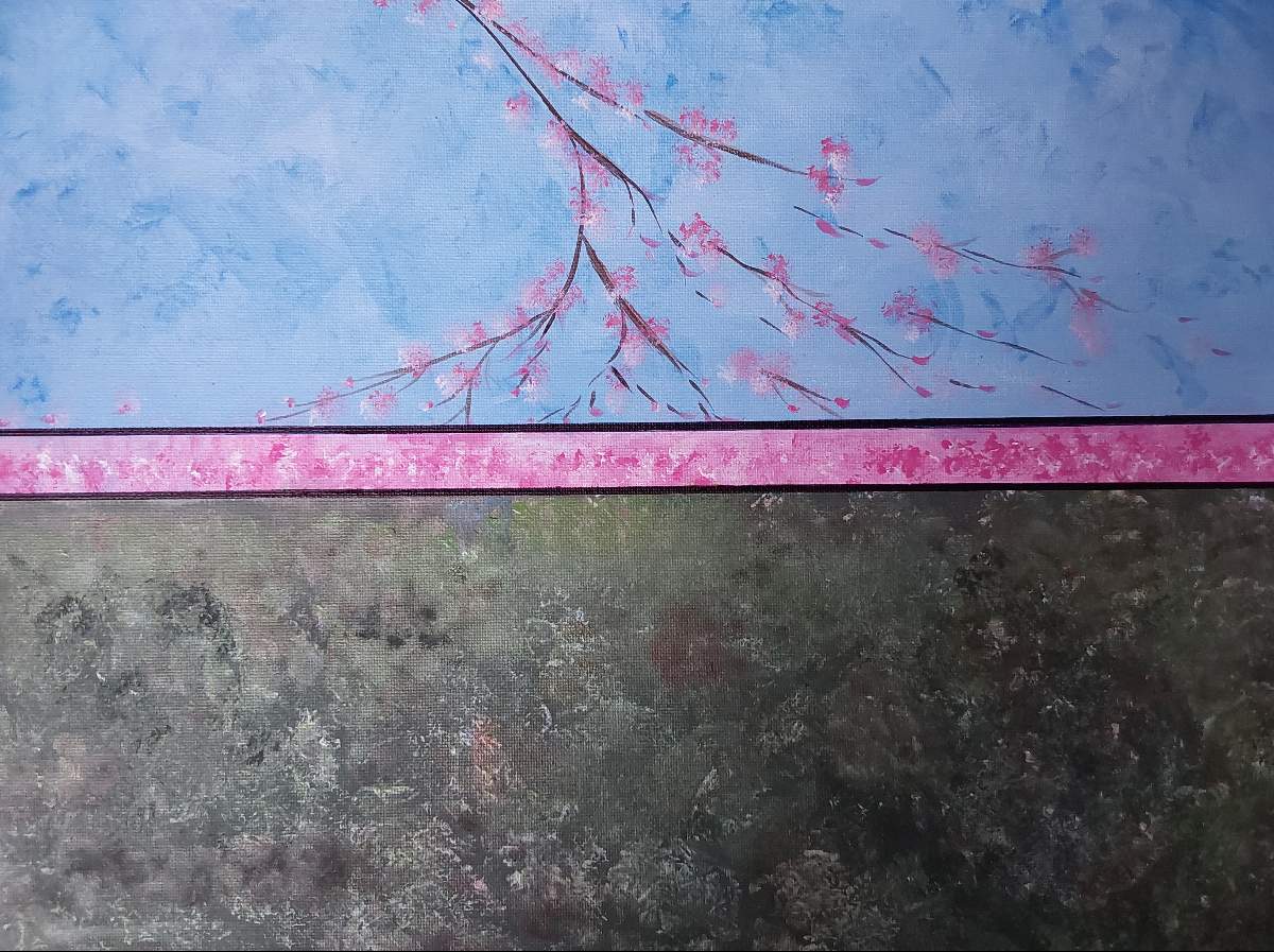 For 20 years I walked past this tree almost every day and she always brought me great joy. I watched her grow and change through every season. When I left my family home never to return, I knew I would miss this gem of nature. As I walked by for the final time the tree was in full bloom with branches heavily laden and weighted down towards the ground. As I looked on, a gust of wind shook the branches and she gave up her load. Cherry blossom raining down all around creating a carpet of pink petals. It was as if she was saying goodbye in the only way she knew how, a sight I will always remember, an emotion I will never forget. . . . I tried to fill the brief although it is quite obvious what it is, I should explain that the black horizontal lines above and below the pink represents the notion that the layer of petals are fixed in place in my mind.