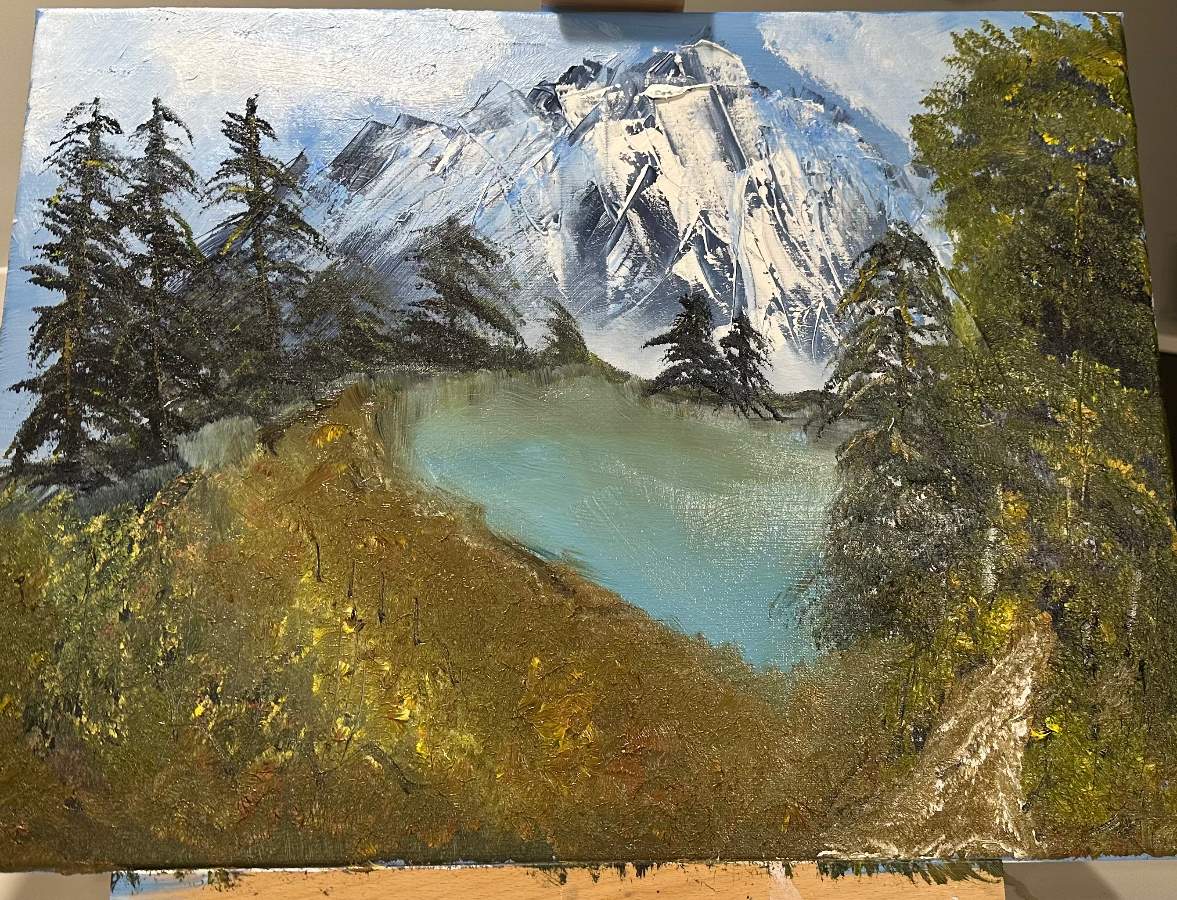 Welcome to the family, You are doing well. May I offer a suggest do the Bob Ross basic 3 color paintings Blue Winter, Gray Winter, Winter Grace and even Winter Mist without the cabin.