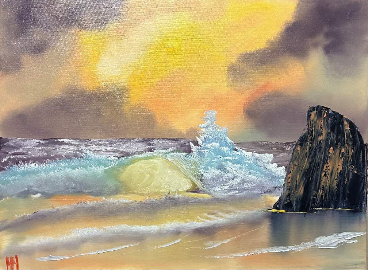Putzed around with some advanced seascape techniques last night, and a painting happened to fall out of the brushes. Really dig the soft pastel colors in this one. I think I’ll call it “On the Coast I’ll Wait”. Thanks for looking :)