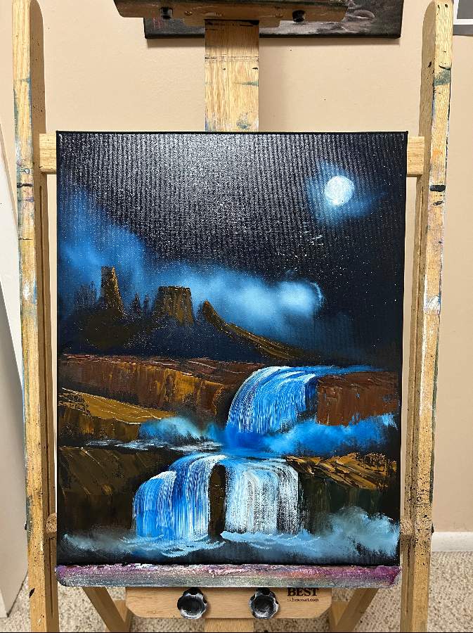 Did a little painting practice the other night. Really enjoy the popping blue water in the foreground. My wife really likes the background mountains. Enjoy this original oil painting, “Winding Canyon”.