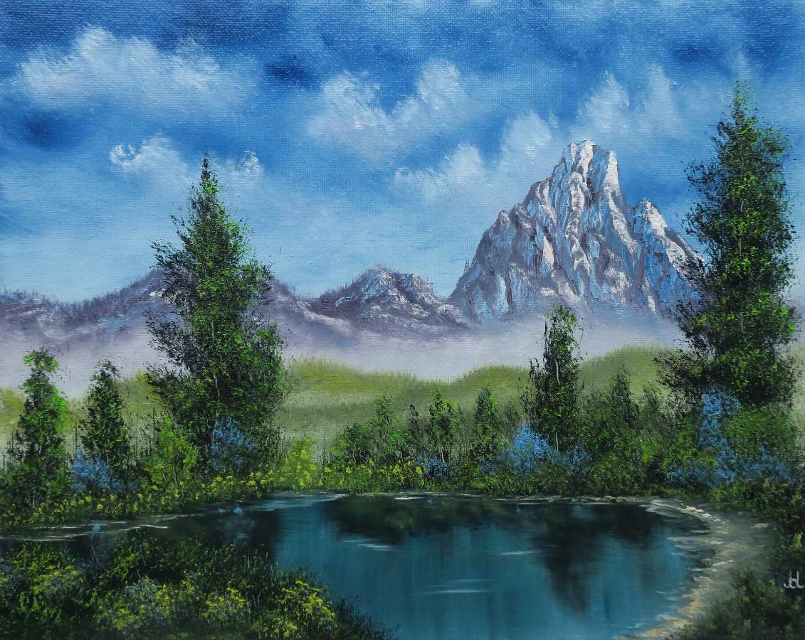 Painted yesterday and what I like in this painting from Bill are the big mountains changing in hills with green foothills in front of them and the use of pt. green in the trees, water and highlights, on canvasboard 30 x 24 cm.