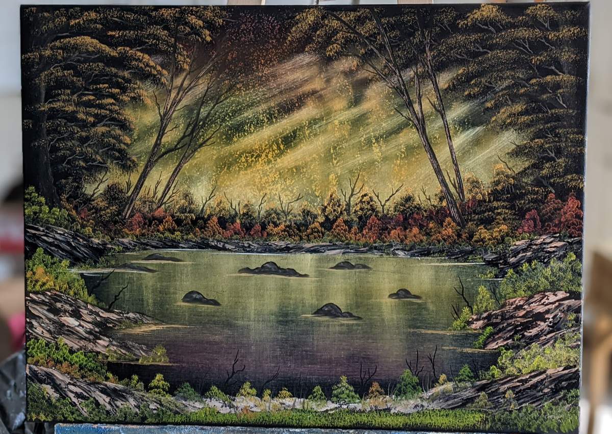 I had this event in mind when painting this one, which is my first painting in half a year. I've always felt at peace in the woods and there's something magical about that beautiful time of day around end of afternoon where sun rays filter through the trees bathing everything in a hazy ochre light.