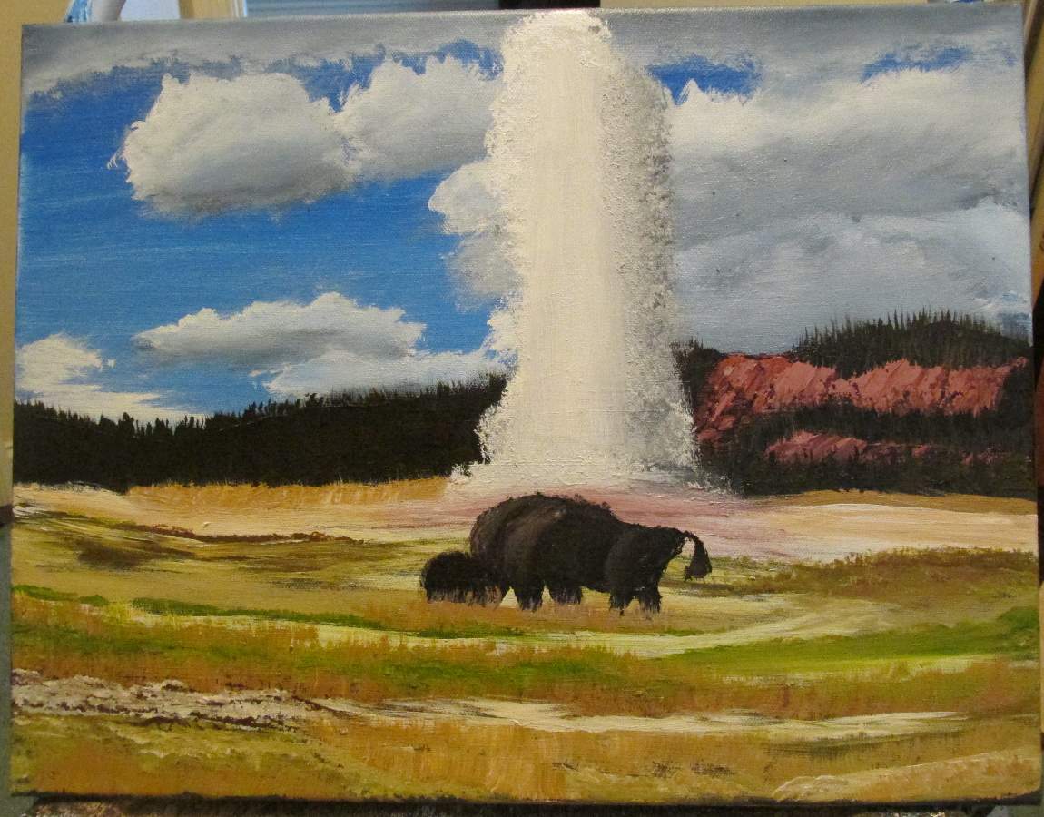 Painted on a 18 x 14 canvas. This painting is inspired by two different paintings. The background and geyser are from one and the Bison from another one. I tried my best to make the trees and grasses look realistic. I really hope the Bison looks good as does Old Faithful. This was very very fun to paint.