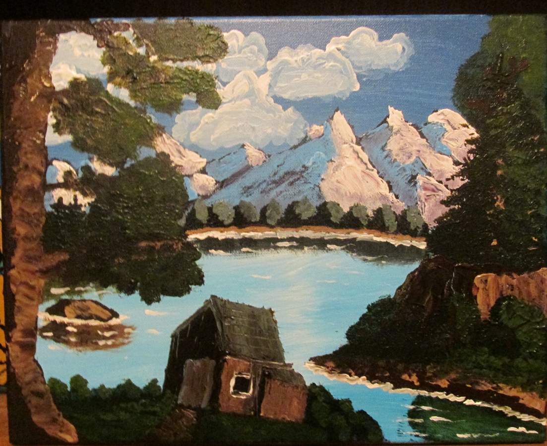 This 11 x 14 canvas painting was inspired by Bob Ross. The idea for the painting came from a dream I had about a small picture of Lakes and Mountains.