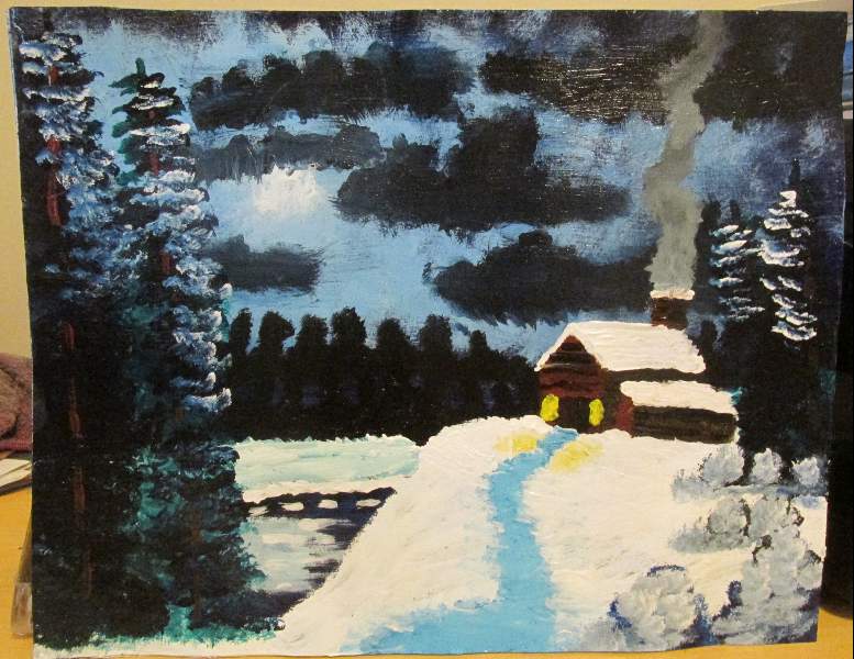 Painted on water color paper about 14 x 11. I rubber cemented three of these papers together and then glued some card board on the back to give this painting some stability. This painting is based off of Golden Glow, but I used phthalo blue, prussian blue, black, phthalo green, and white with a little browns and yellow. I also did two in crimson.