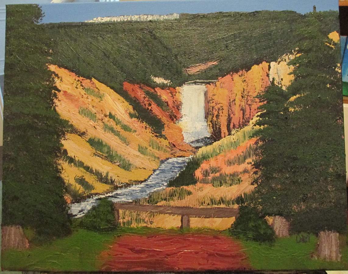 Painted on a 20 x 16 canvas. This was a challenge to paint. It is from a photograph of the Lower Falls of the Grand Canyon at Yellowstone Park. I am not sure where the photo was taken either lookout point or artiste point. I made the rocks more colorful because the photo did not capture the colors that exist with the human eye. I added the foreground to give something there. I like how it turned out, but wish the rocks could have been better and maybe I should have added something in the midground to push everything else back. TThe rocks surronding the falls do actually have shades of yellows, oranges, and pinks.
