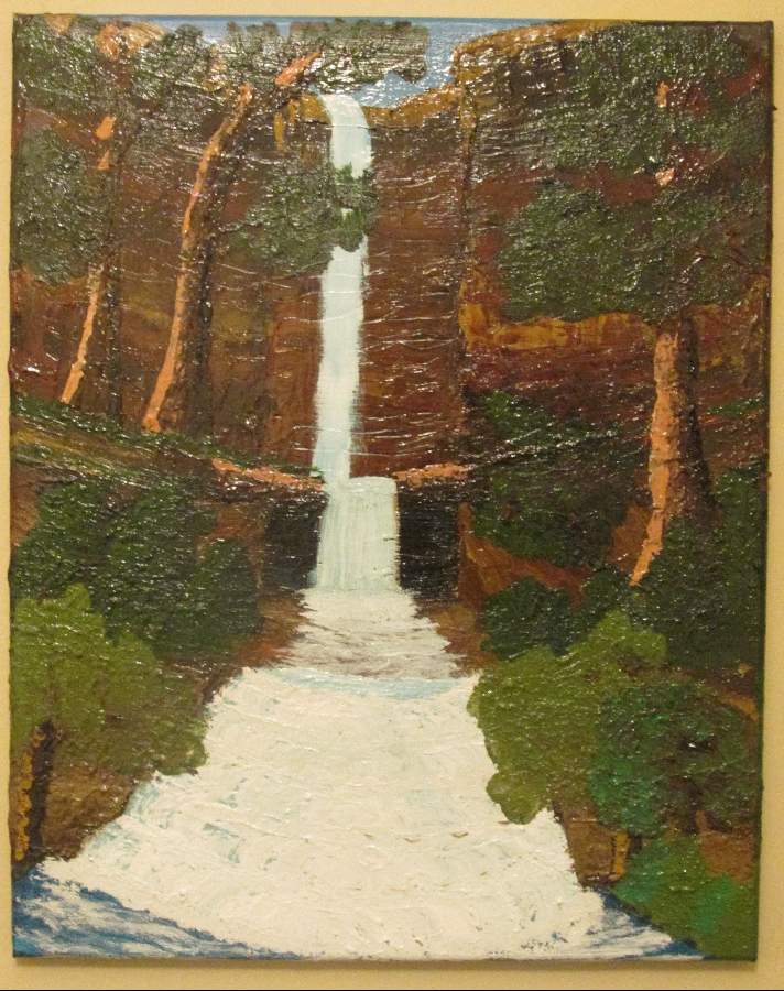 I painted this on a 16 x 20 canvas. The inspiration comes from three different waterfalls that are in separate areas in Shades State Park in Indiana. The park was once called shades of death state park.