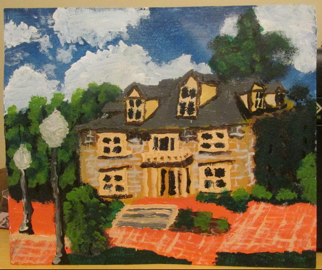 This painting is painted on watercolor paper that is cemented to another paper, then cemented to some cardboard. It is around 11 x 14 and based off of a picture taken by David Ellis. This is the LL Ball house in Muncie Indiana where Bob Ross filmed The Joy of Painting from 1984 to 1988. I added some trees to one side of the house because the windows were making it difficult. It was my first attempt at house of this scale and was challenging to get the perspective even close to looking good.