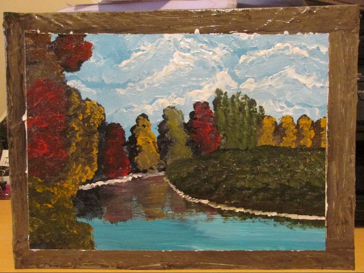 I imagined the same White River spot just in the fall. This was painted on a 12 x 9 watercolor paper that has been glued to another paper and backed with a clear plastic. The boarder is painted painters tape.