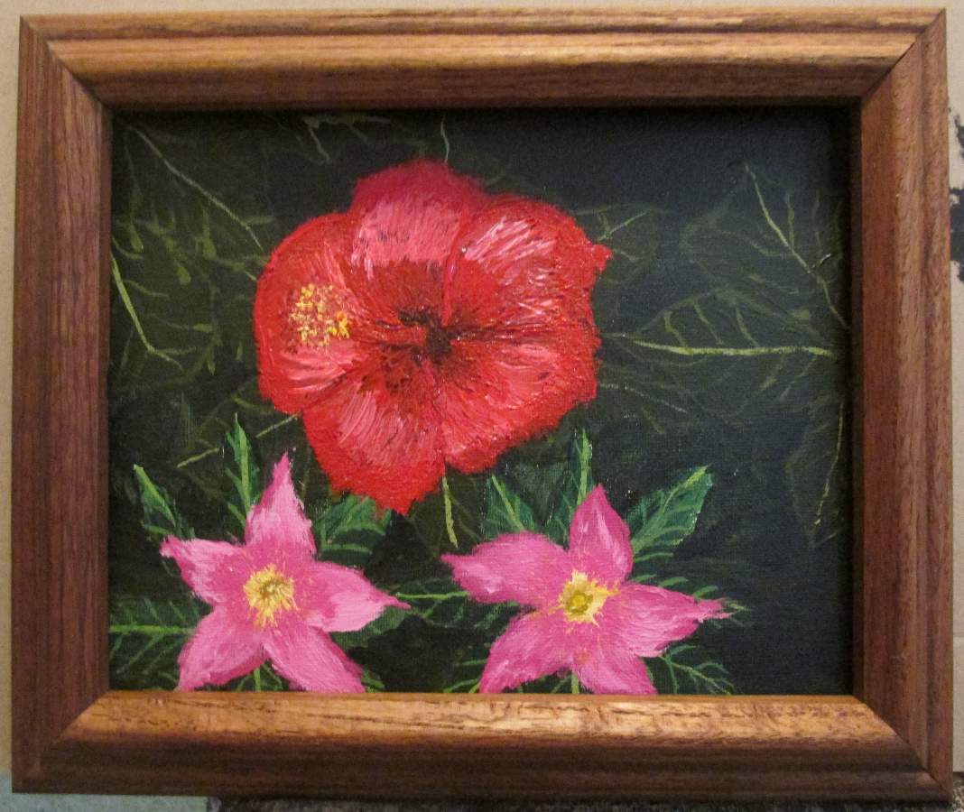 Painted on a 10 x 8 canvas. I used two flowers from the front of my yard to give me inspiration for this one. I love how the upper hibiscus turned out and how the frame matches the painting.